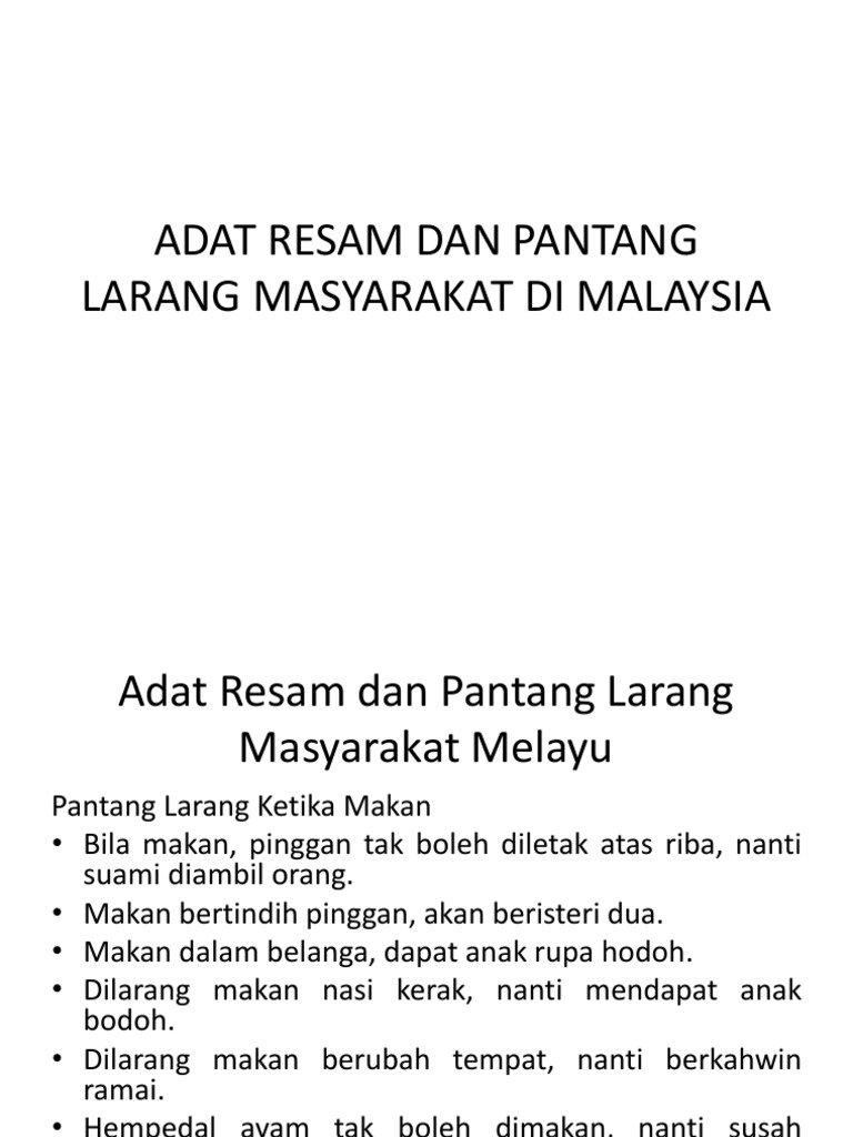 Pantang Larang Masyarakat Melayu from image.slidesharecdn.com Orang mengandung jangan memukul ular, nanti anak yang dilahirkan akan cacat atau tidak sempurna sifatnya. Kaum melayu dengan pantang larang memang tak dapat dipisahkan. Tapi, yang paling kerap ditujukan adalah kepada ibu mengandung. 5 pantang larang orang melayu dipengaruhi kepercayaan masyarakat hindu. Dalam era kemodenan ini pantang larang masyarakat melayu merupakan sesuatu yang dianggap lapuk dan sudah tidak boleh dipakai lagi. Masyarakat melayu memang kaya dengan adat resam dan pantang larangnya yang tersendiri. Adat & pantang larang masyarakat kaum melayu. Kebanyakan pantang larang diturunkan secara lisan turun kemurun.