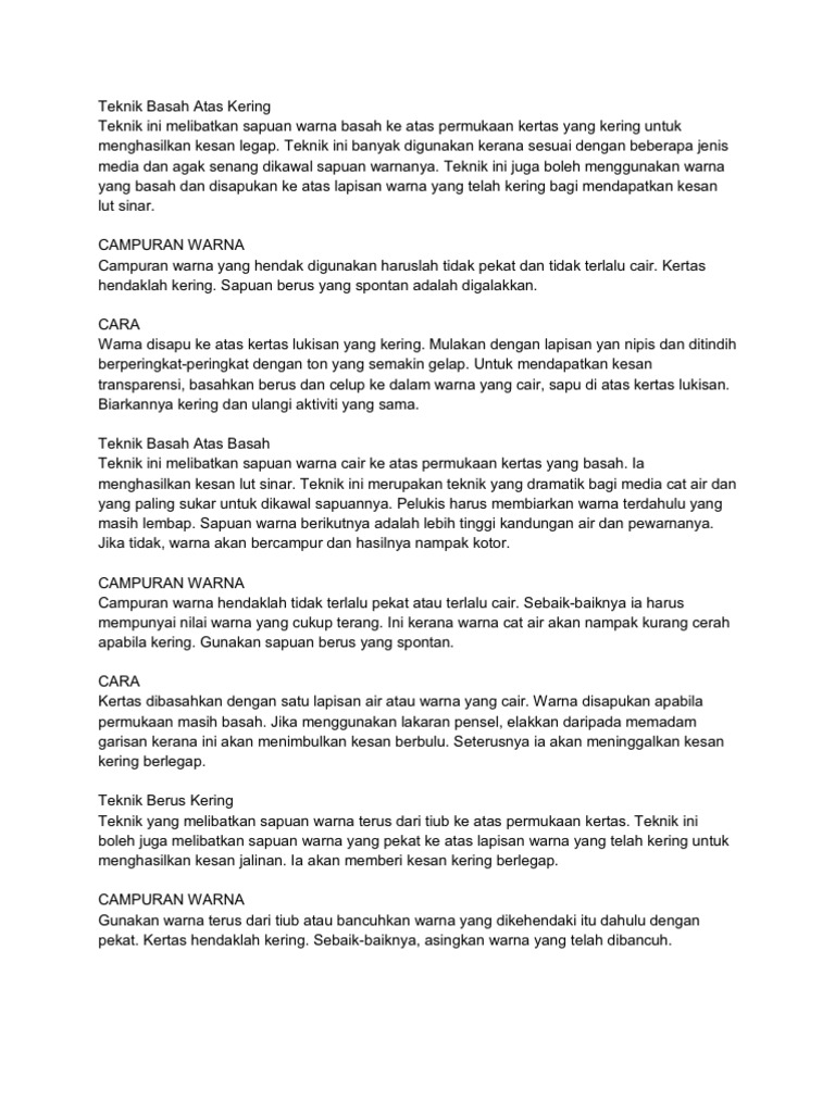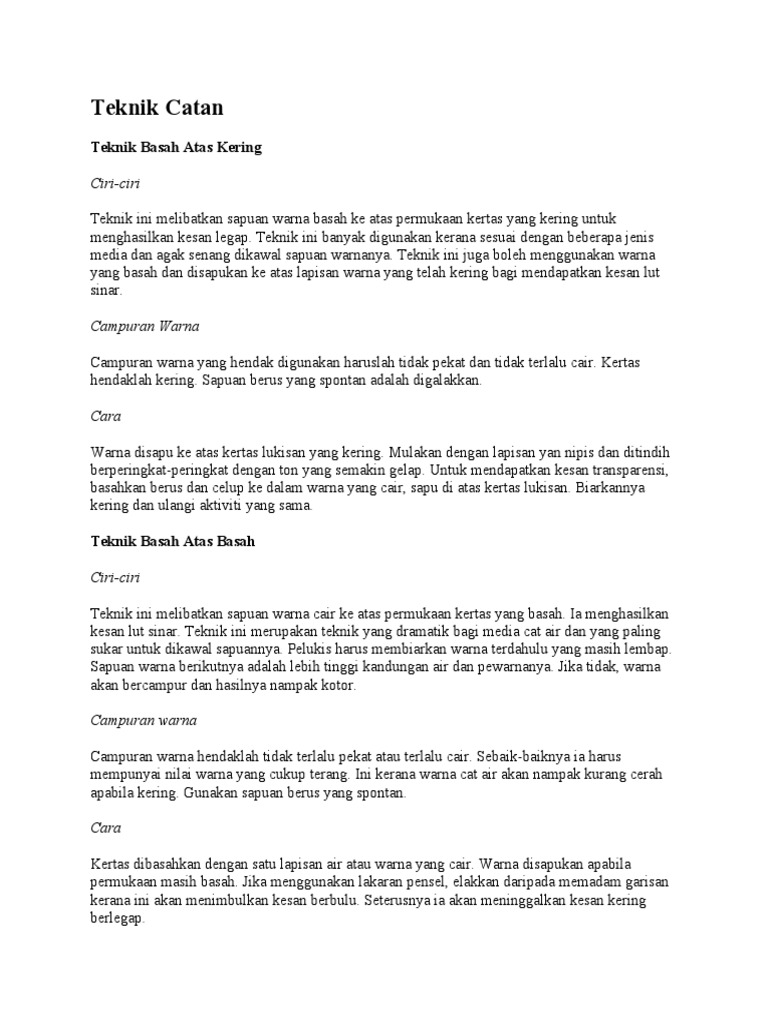 Murid telah mempelajari sejarah dan mengenali tokoh catan. Setiap teknik memasak akan menghasilkan keunikan rasa dan tampilan yang khas. Ni painting wkt d ting.4(2011). Teknik ini dilakukan dengan memasukkan warna lain di atas warna yang sudah ada saat catnya masih basah. Teknik ini dilakukan dengan memasukkan warna lain di atas warna yang sedia ada semasa basah.